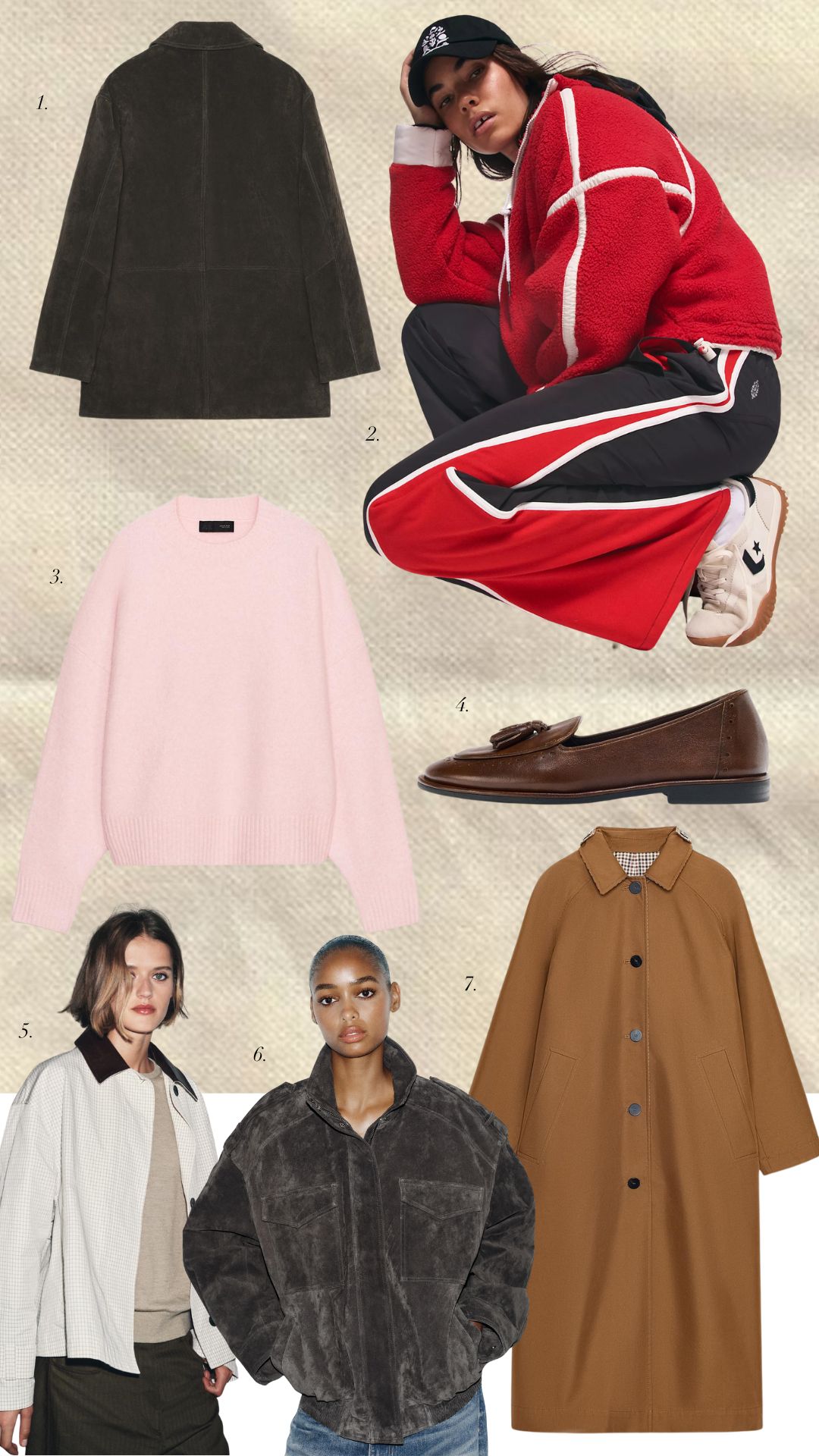 1. Zara suede blazer, 2. FP windbreaker pants, 3. Pink sweater, 4. Loafers, 5. Short trench, 6. Black suede jacket, 7. Reversible trench
